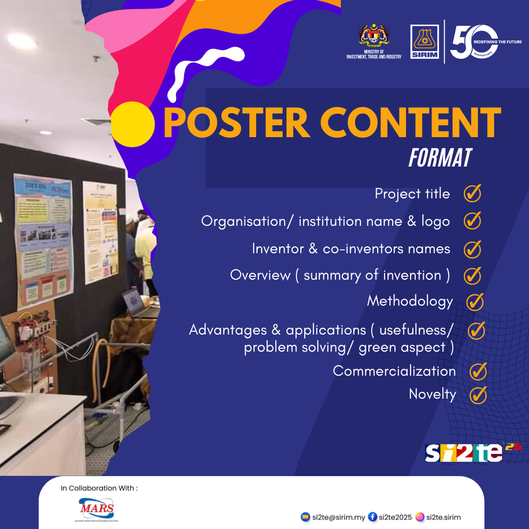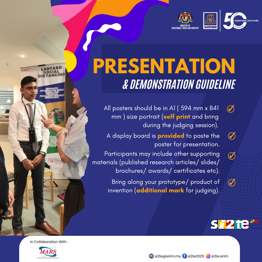 SIRIM Invention, Innovation & Technology Expo Competition (Si2TE) organized by SIRIM Berhad presents an exciting opportunity for inventors to gain recognition for their invention and innovation ideas. This prestigious platform is open for primary school, secondary school, matriculation, vocational, polytechnic, IPT, Research Institute, SME and international participation.